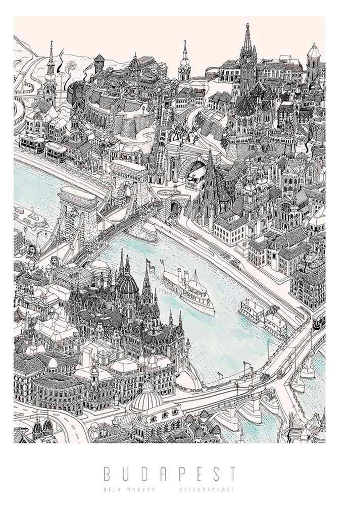 "Very detailed freehand pen and ink Bird's Eye View Map of Budapest (Hungary). This perspective map presents the city in an unusual way: it was drawn with a single technical pen, a metropolis from my point of view.