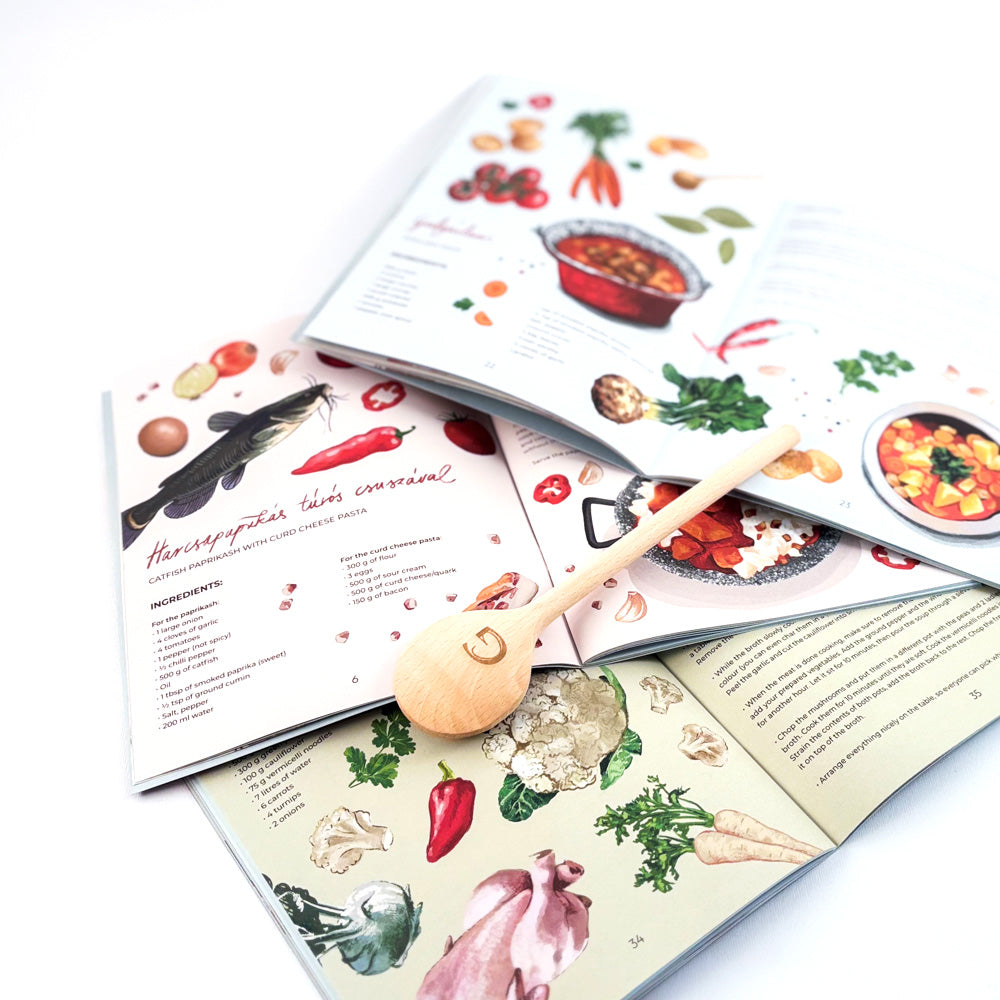 Beautifully illustrated booklet with 30 traditional Hungarian recipes. Comes with a solid wooden spoon.