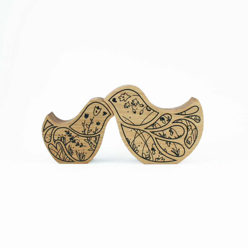 Wooden decoration shaped like love birds, screenprinted with typical hungarian plant and flower motifs.