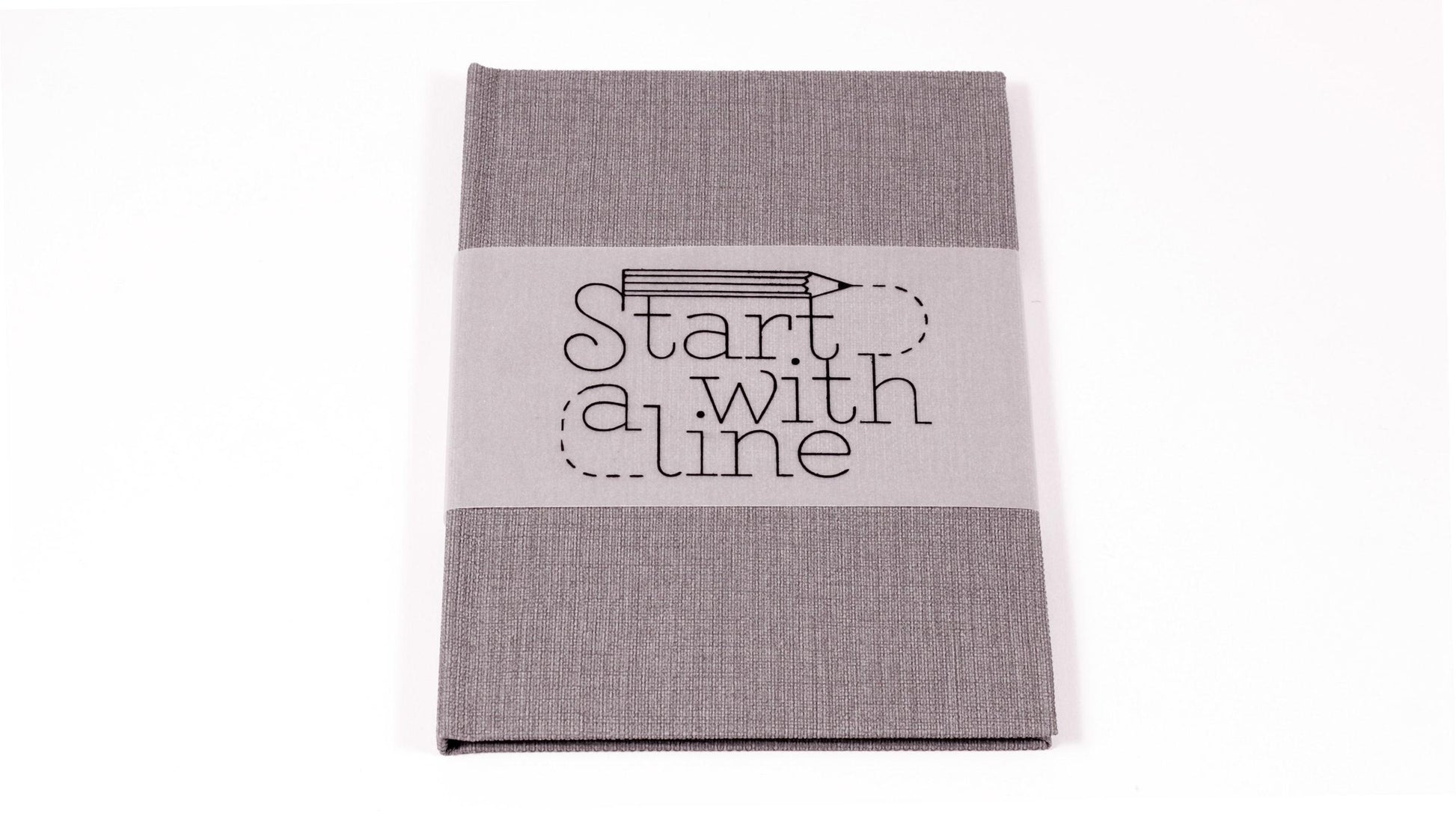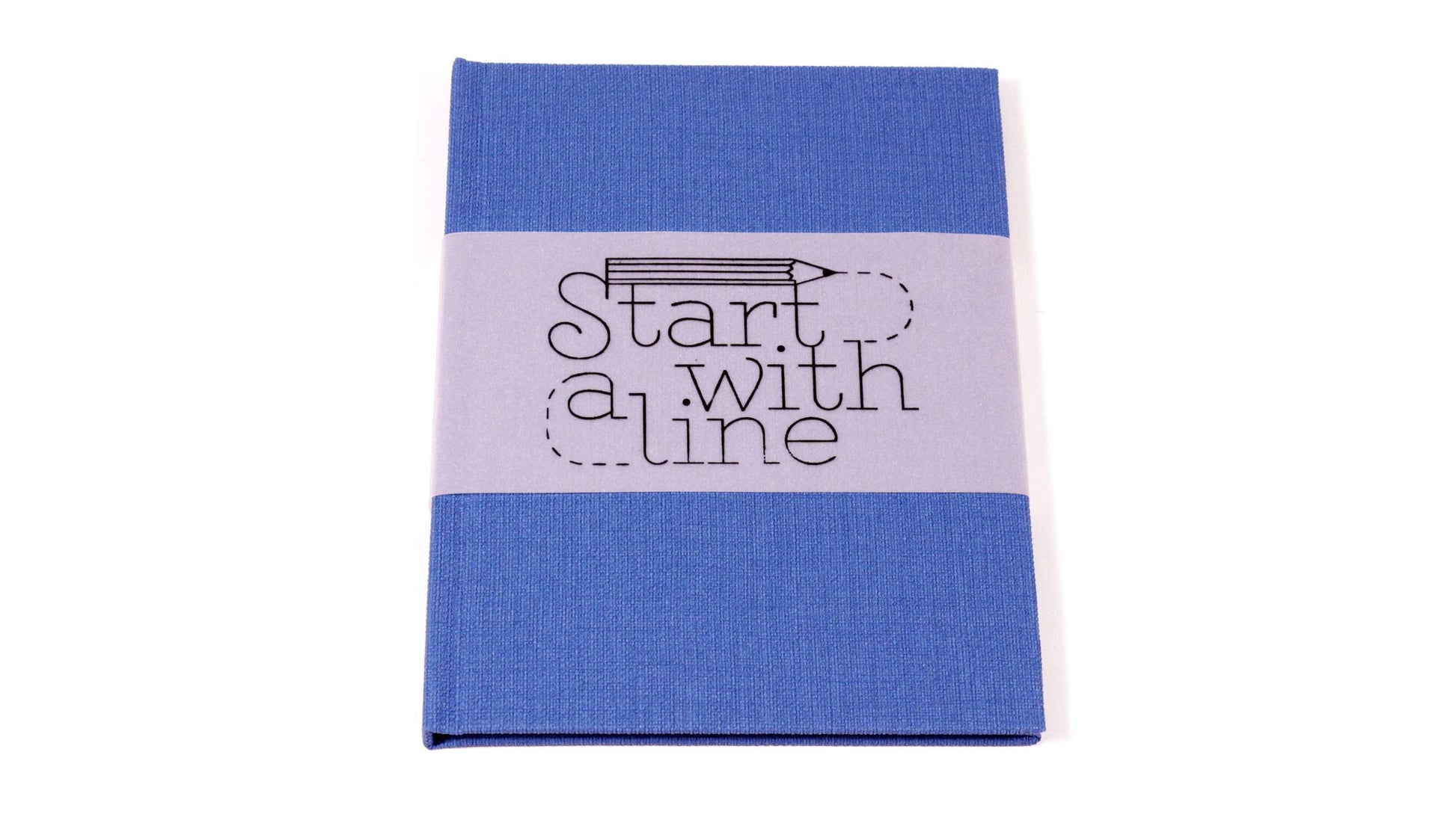 Hardback notebook, in different colours. 'Start with a line' is printed on the notebook's first page inside.