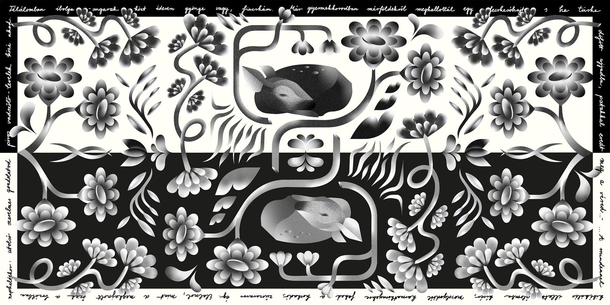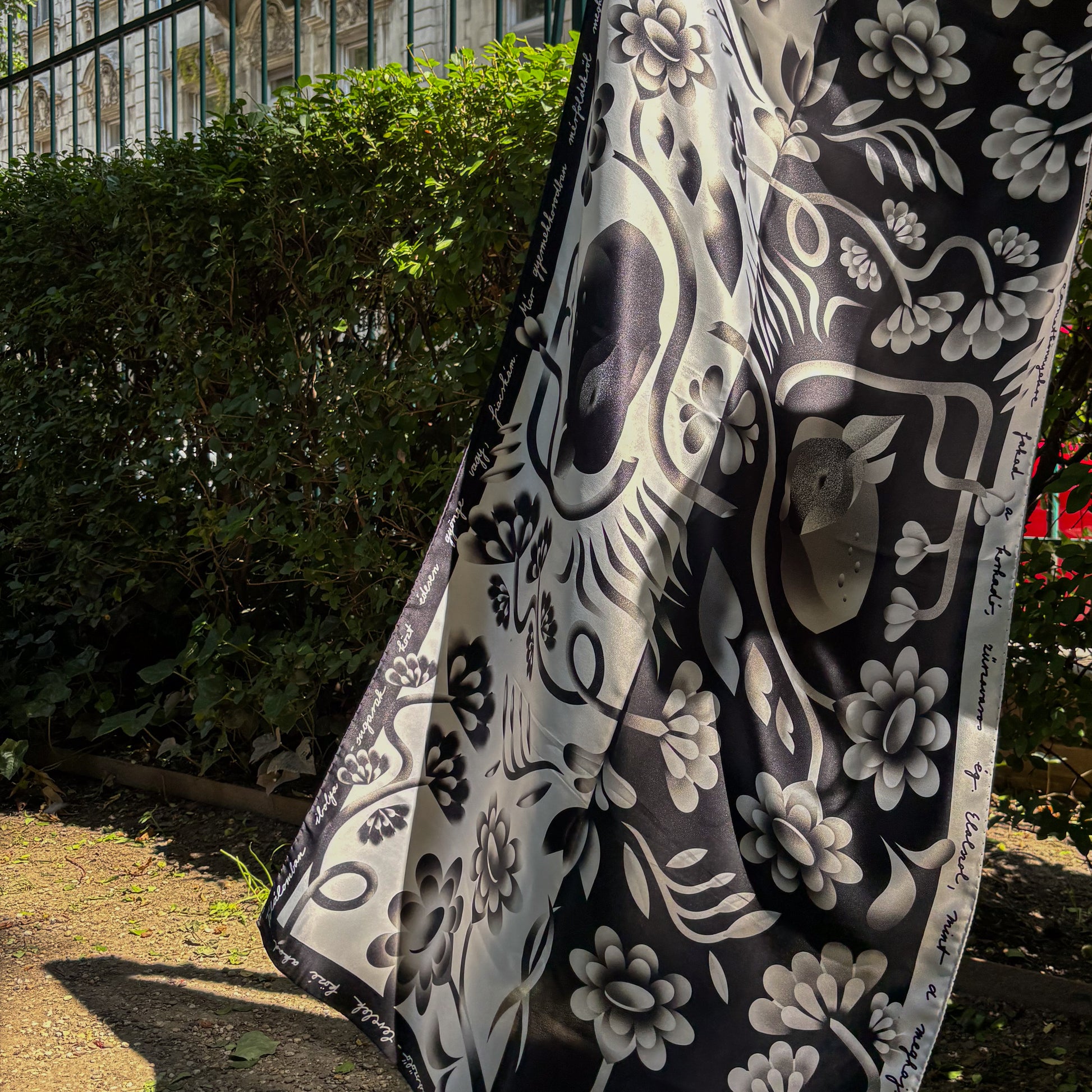 Silk scarf with "Mint az őzek" graphic by Eszter Kiss. Inspired by a Jenő Dsida poem, "Elalszom, mint az őzek".