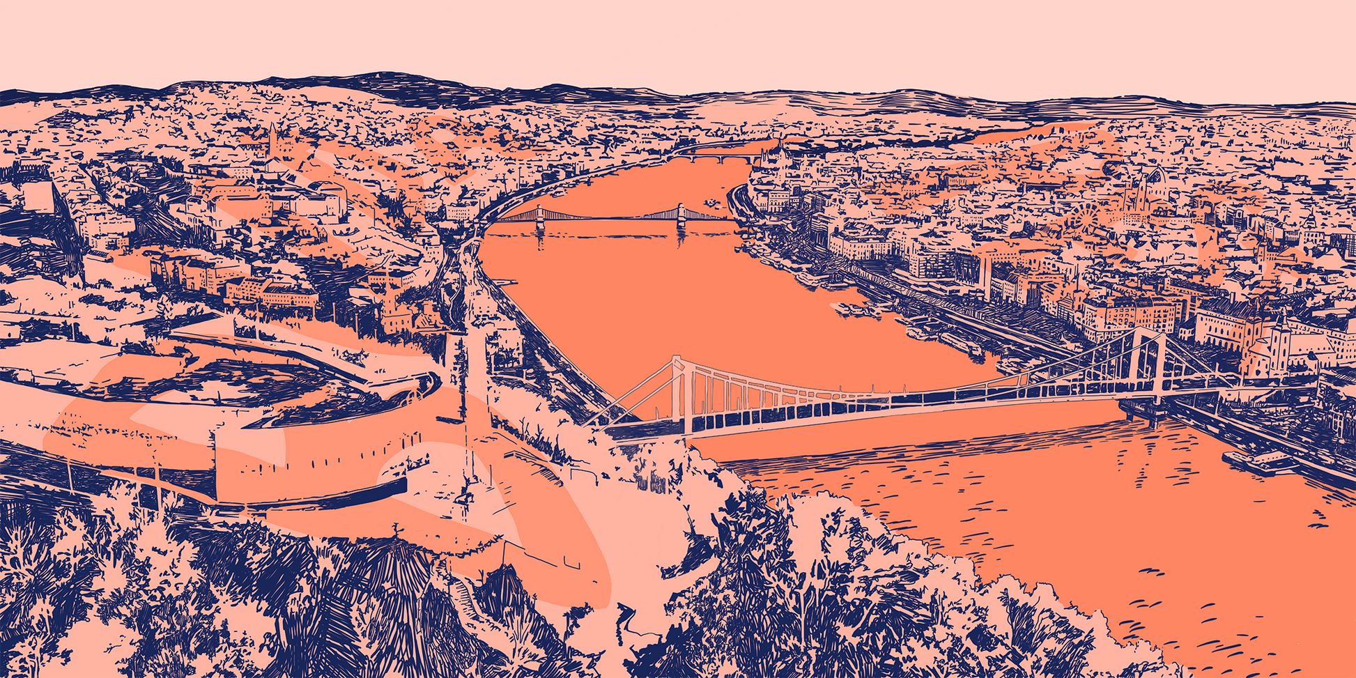 Silk scarf with "Above Budapest" graphic by Júlia Csapó.