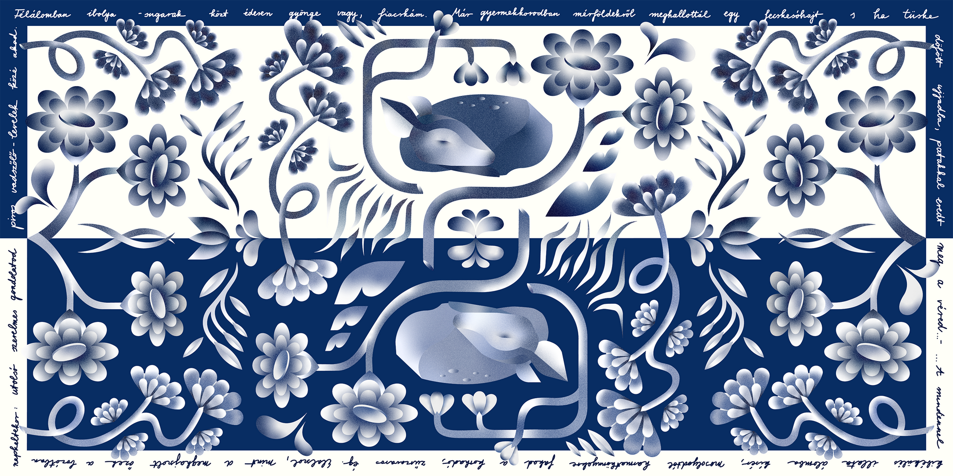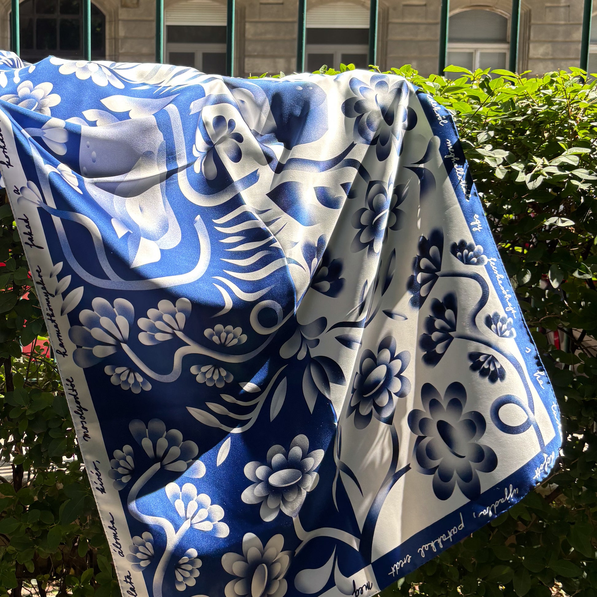 Silk scarf with "Mint az őzek" graphic by Eszter Kiss. Inspired by a Jenő Dsida poem, "Elalszom, mint az őzek".