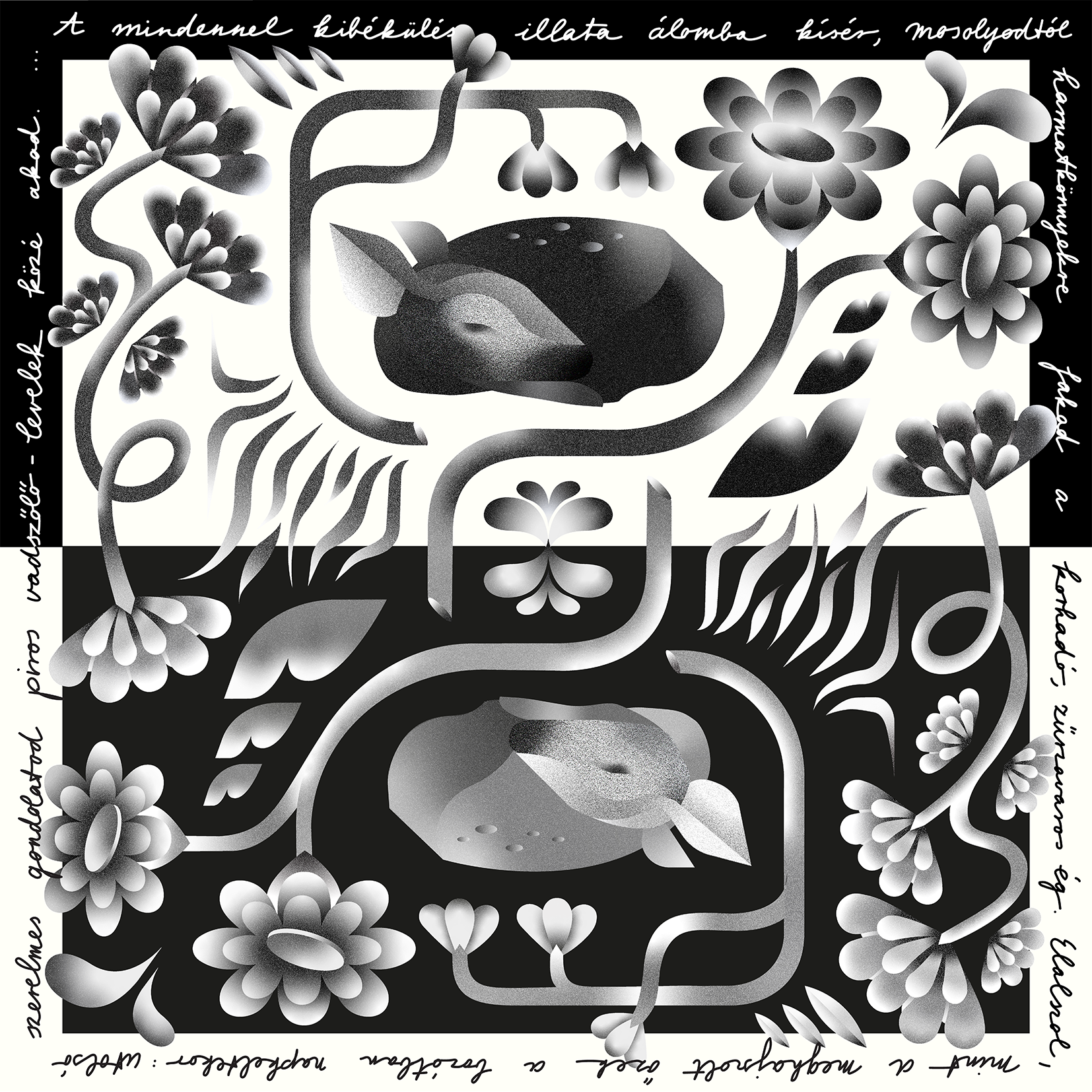 Silk scarf with "Mint az őzek" graphic by Eszter Kiss. Inspired by a Jenő Dsida poem, "Elalszom, mint az őzek".