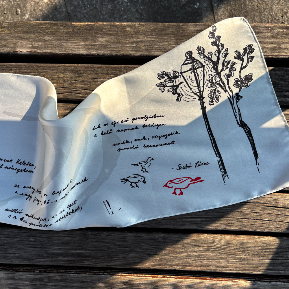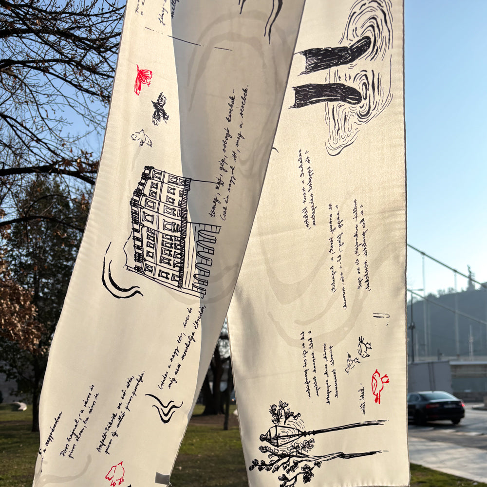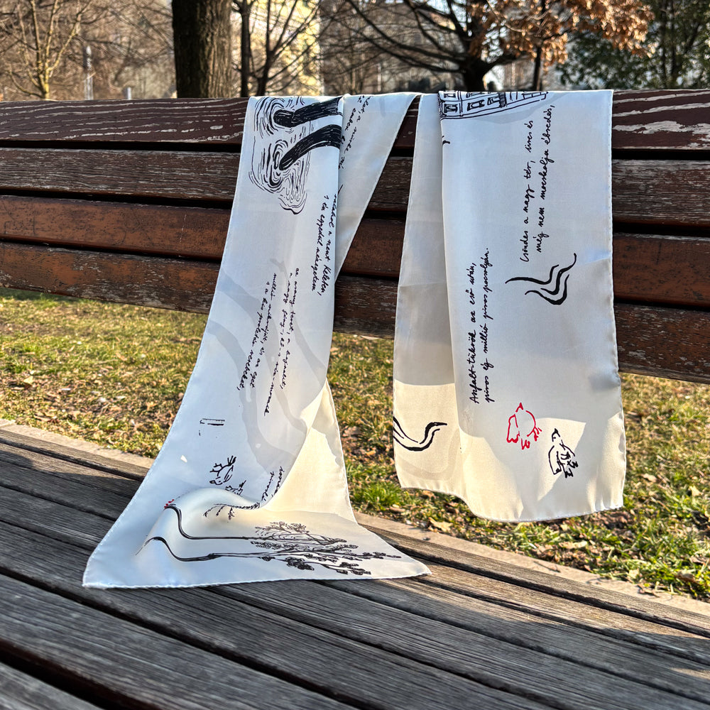 Silk scarf with "Poem" graphic by Eszter Kiss.