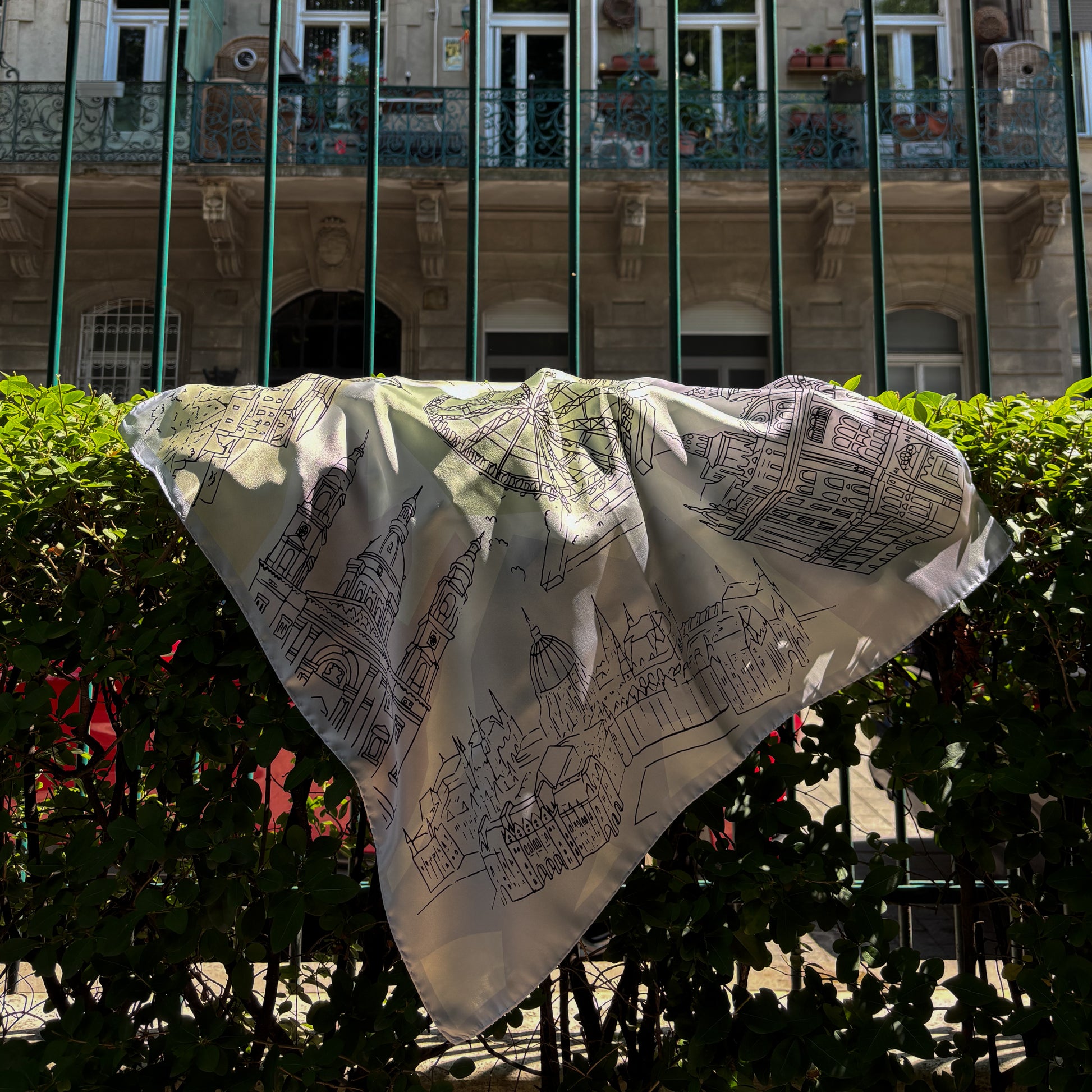 Silk scarf with "Pastel Budapest" graphic by Dorka Halász.