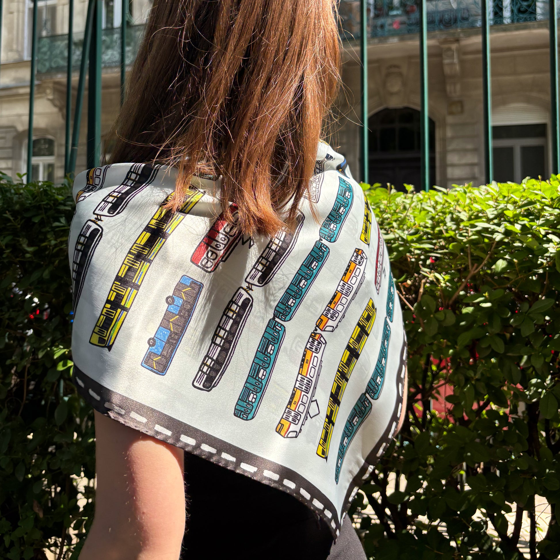 Silk scarf with "Traffic" graphic by Dorka Halász.