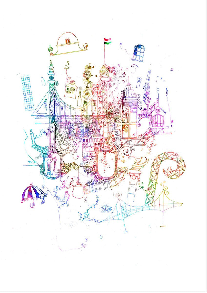 "Mixed media, I drew the original picture with technical pen (Rapidograph) on tracing paper, then I modified, colourized with Wacom Cintiq digital pen and tablet. Signed and titled by myself in pencil on the front of the print just underneath the image." Béla Magyar