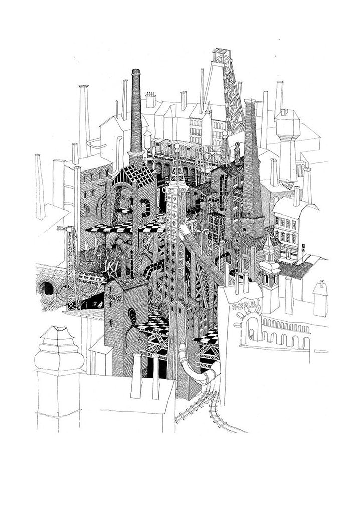 "This drawing was inspired by the films (like Stalker, Solaris, Mirror) of Andrei Tarkovsky, the Russian movie director. I was deeply impressed, affected by those crumbling industrial plants, forgotten, rusty steel framed assembling halls, and the quiet slowly flowing water everywhere.