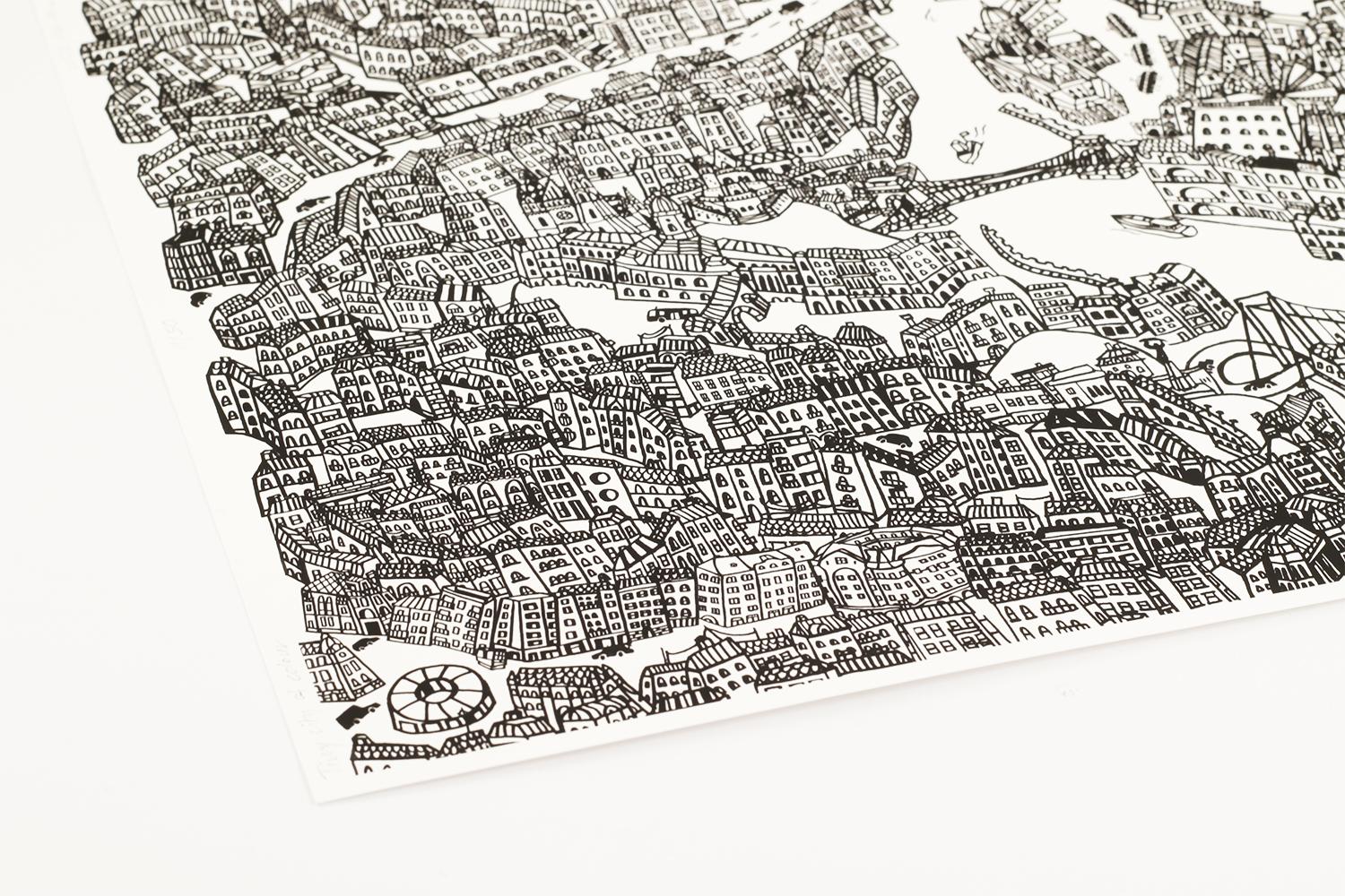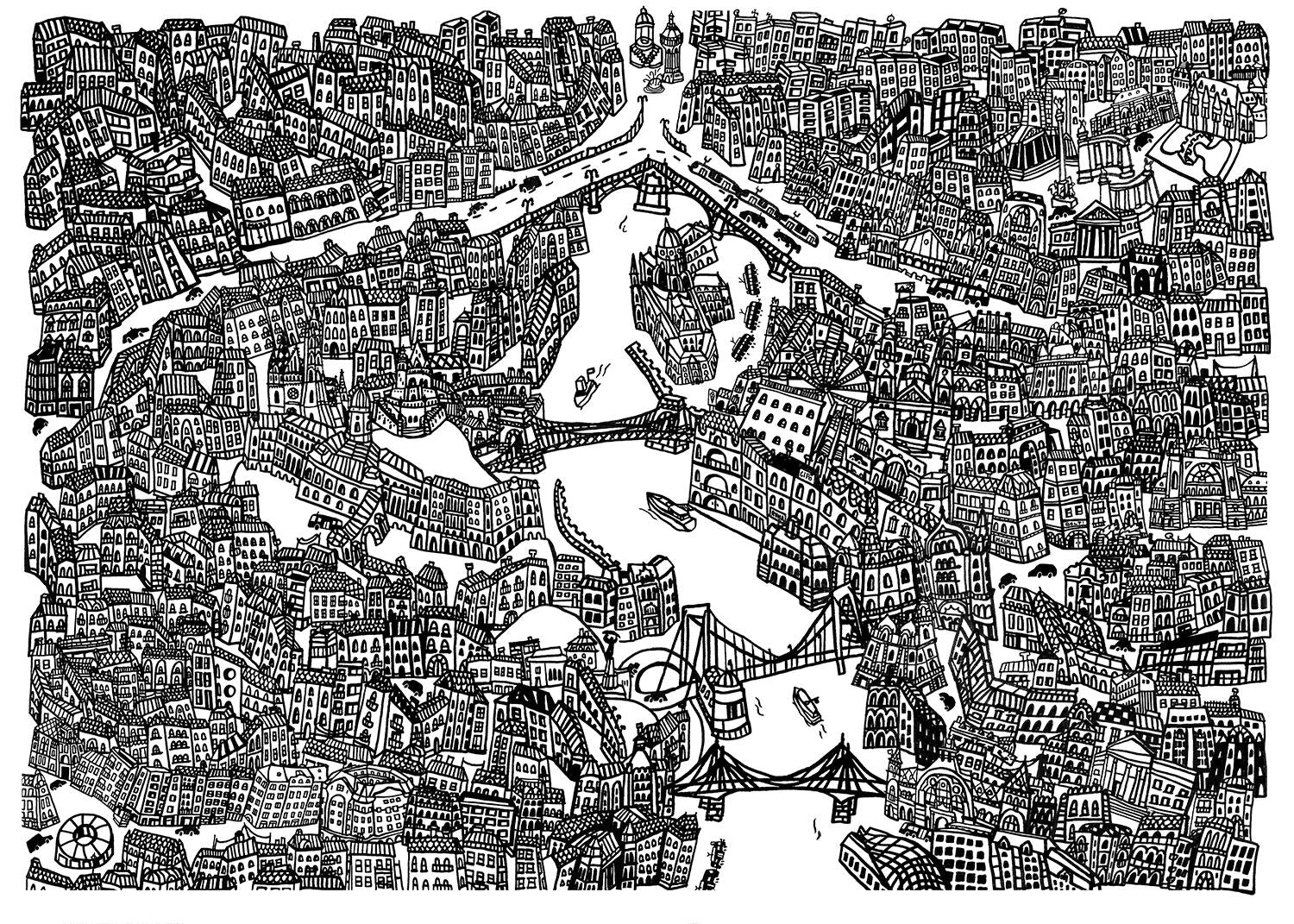 Tiny city of colour giclée print on premium paper by Eszter Kiss. Make it your own by colouring it to your liking!
