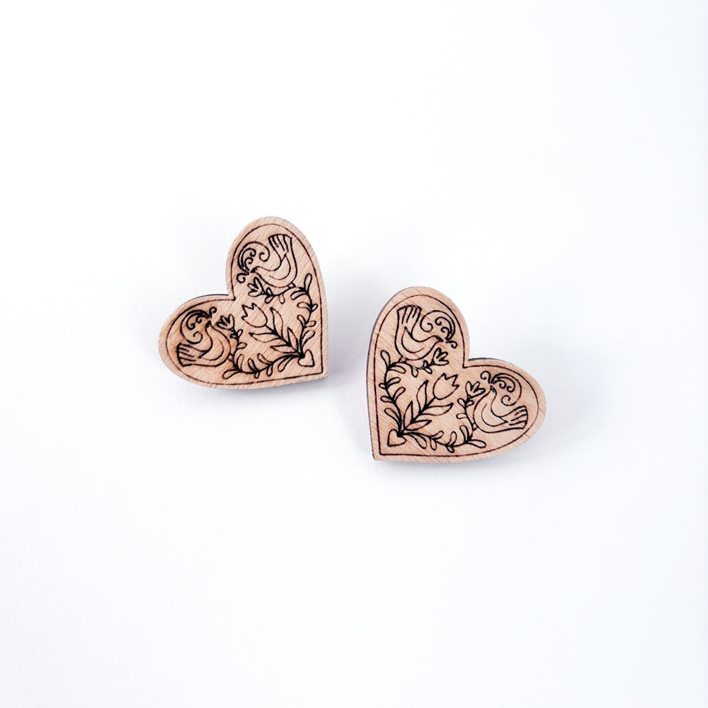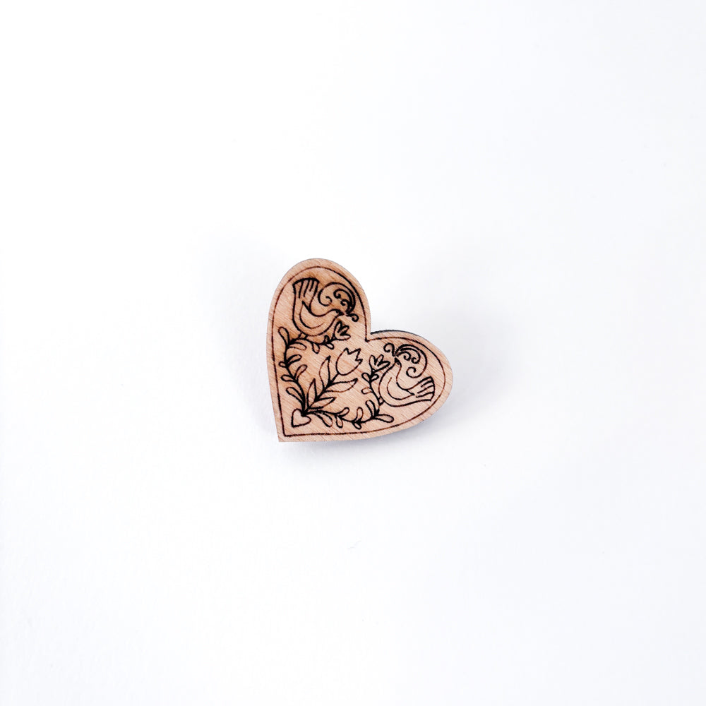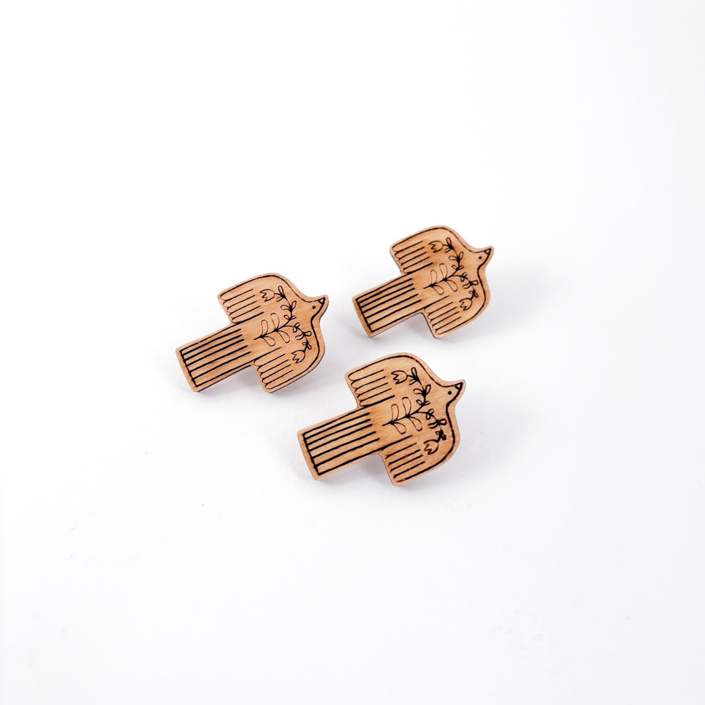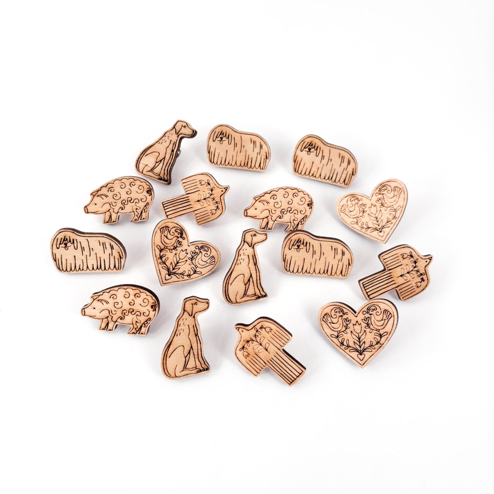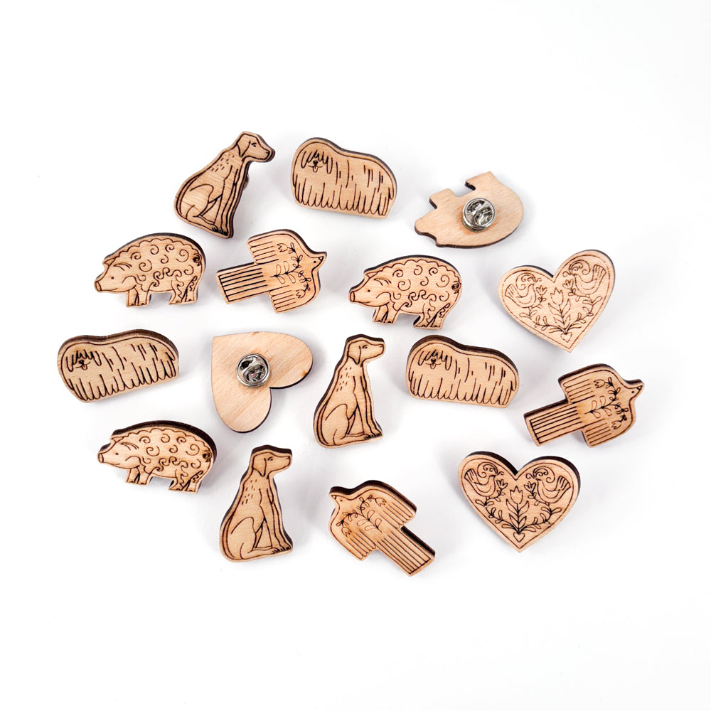Lasered wooden pins with Hungarian motifs.